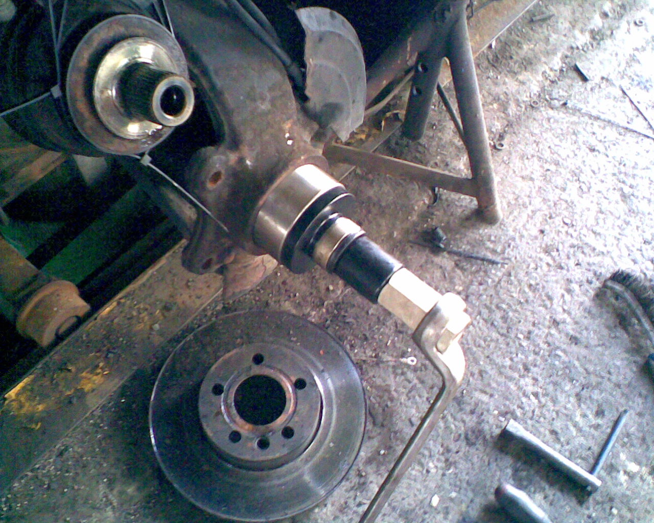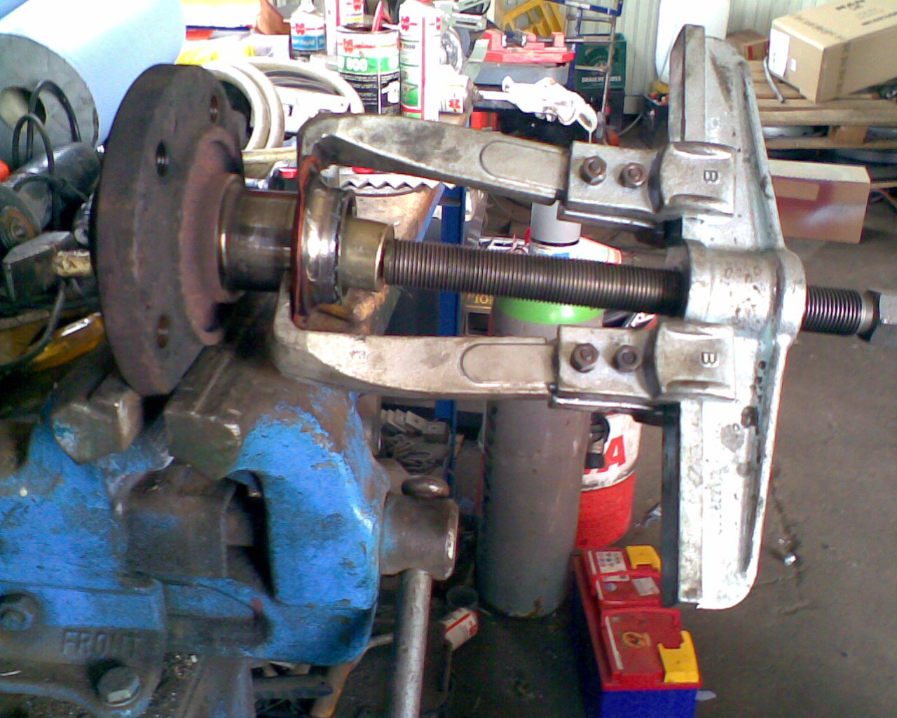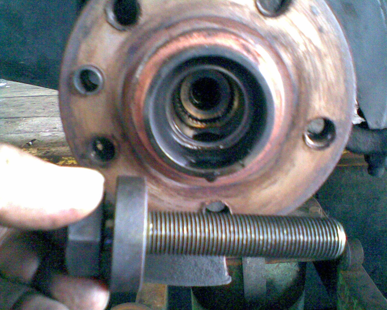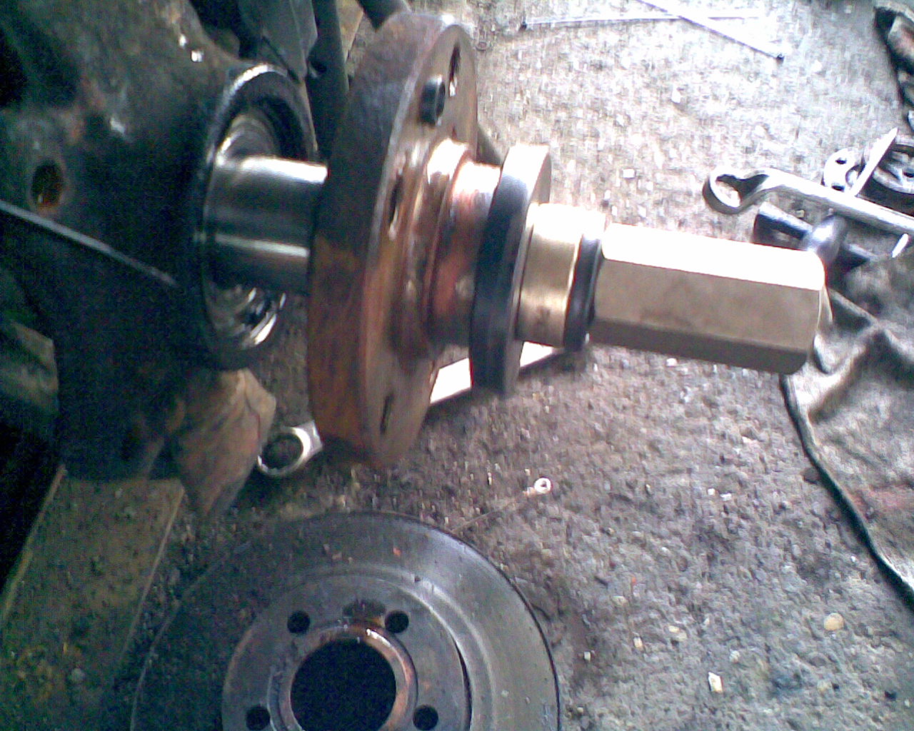 6.) Radnabe abziehen. Dazu habe ich Radlagerauspress Werkzeug gekauft (99 Euro incl Versand,gibts auch bei 1 2 3) . Dabei sind 3 Abzieherschrauben, die in den Schraublöchern der Radbolzen passen. Hier ist ein Problem. Diese Abzieherschrauben können nicht auf das Radnarbengehäuse anpressen, da es zu breit ist. Also Vorsicht, nicht dass die Abzieherschraubengewinde kaputt gehen. Ich war so frech und habe meine alten Bremsbeläge und Metallplatten dazwischen gelegt, sie waren eh schon runtergefahren. Aber vieleicht hat ja jemand eine bessere Idee oder geeigneteres Werkzeug.