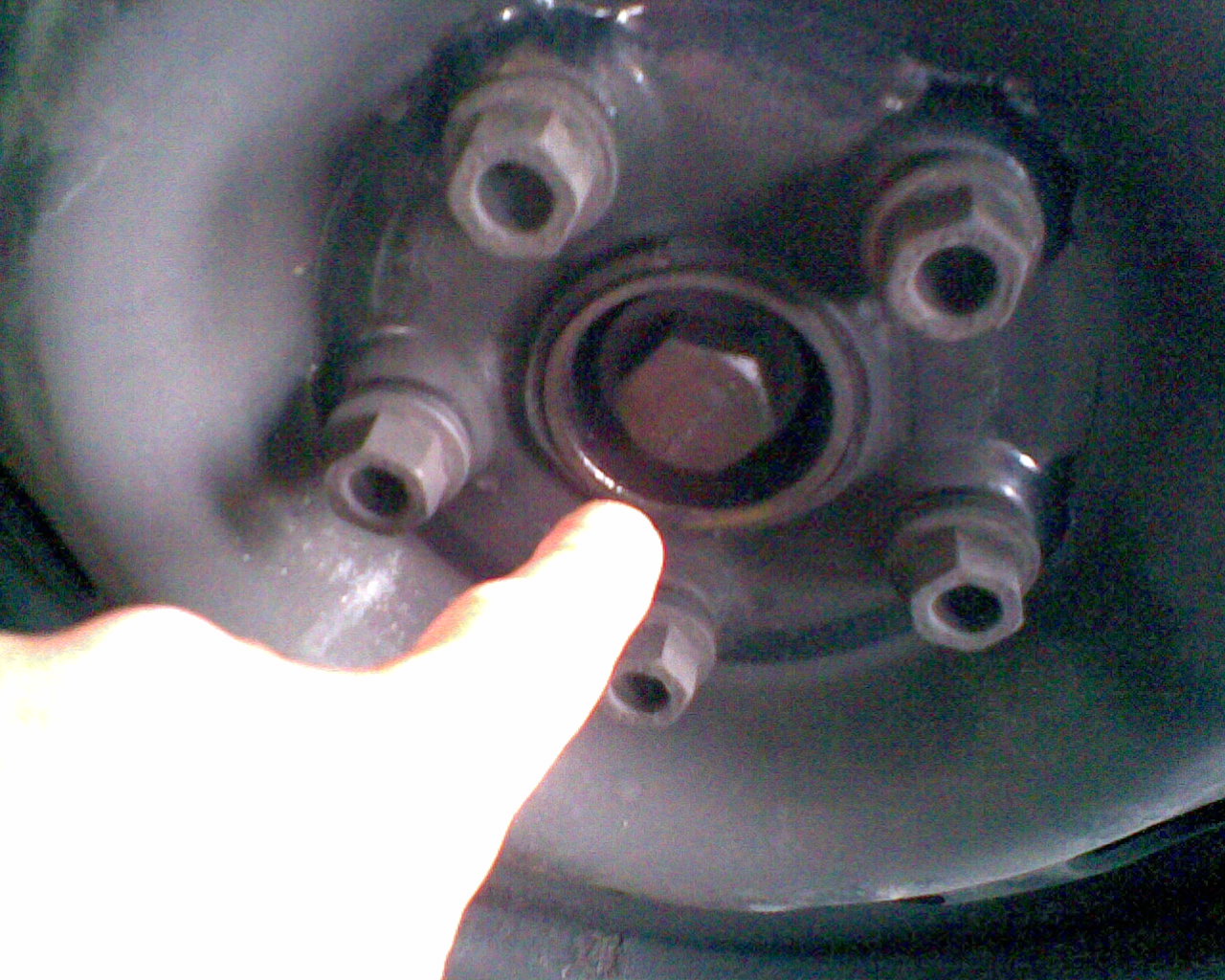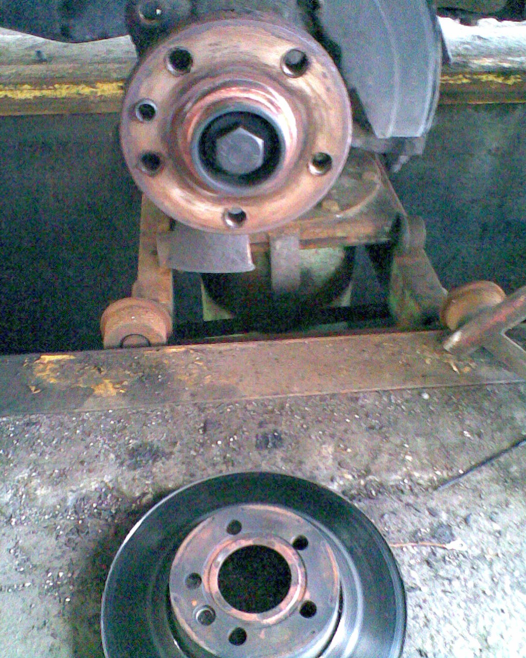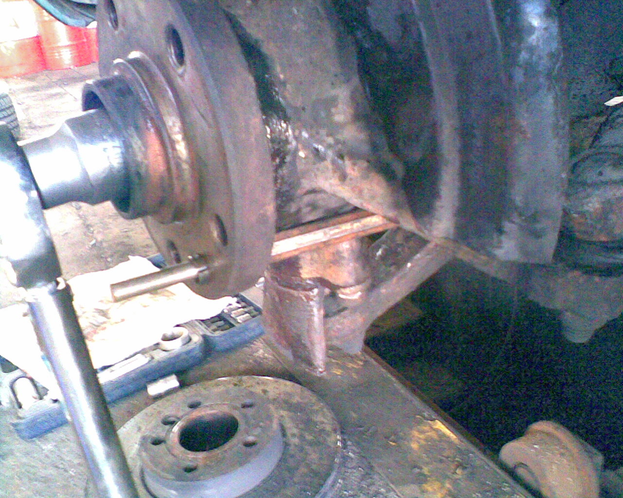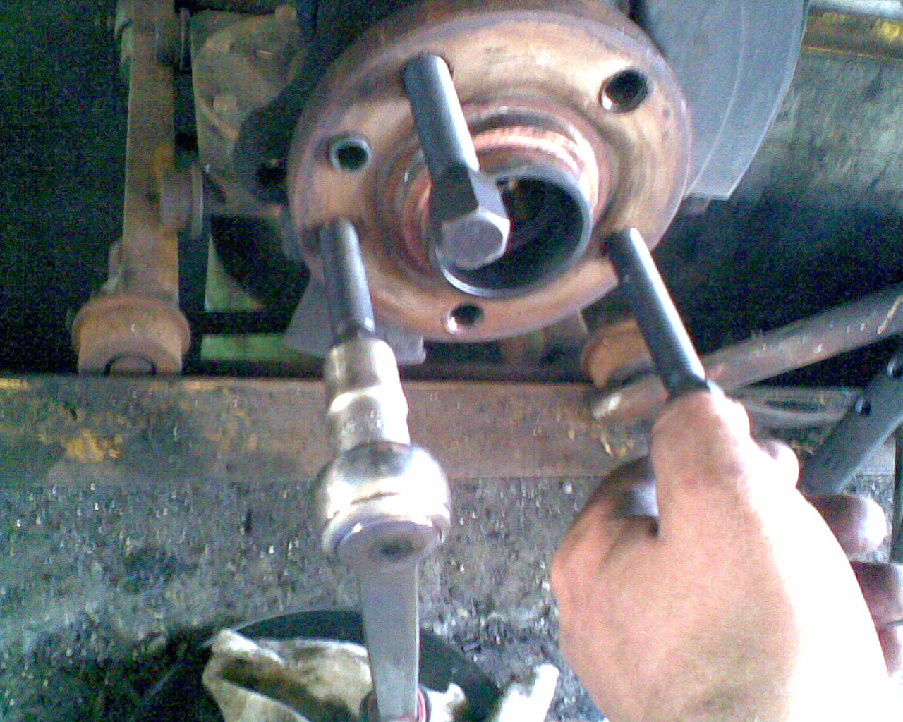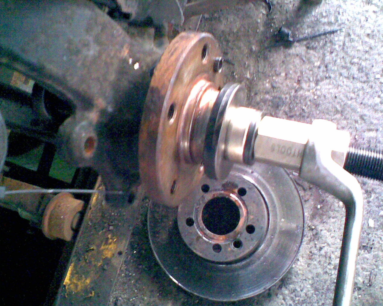 6.) Radnabe abziehen. Dazu habe ich Radlagerauspress Werkzeug gekauft (99 Euro incl Versand,gibts auch bei 1 2 3) . Dabei sind 3 Abzieherschrauben, die in den Schraublöchern der Radbolzen passen. Hier ist ein Problem. Diese Abzieherschrauben können nicht auf das Radnarbengehäuse anpressen, da es zu breit ist. Also Vorsicht, nicht dass die Abzieherschraubengewinde kaputt gehen. Ich war so frech und habe meine alten Bremsbeläge und Metallplatten dazwischen gelegt, sie waren eh schon runtergefahren. Aber vieleicht hat ja jemand eine bessere Idee oder geeigneteres Werkzeug.