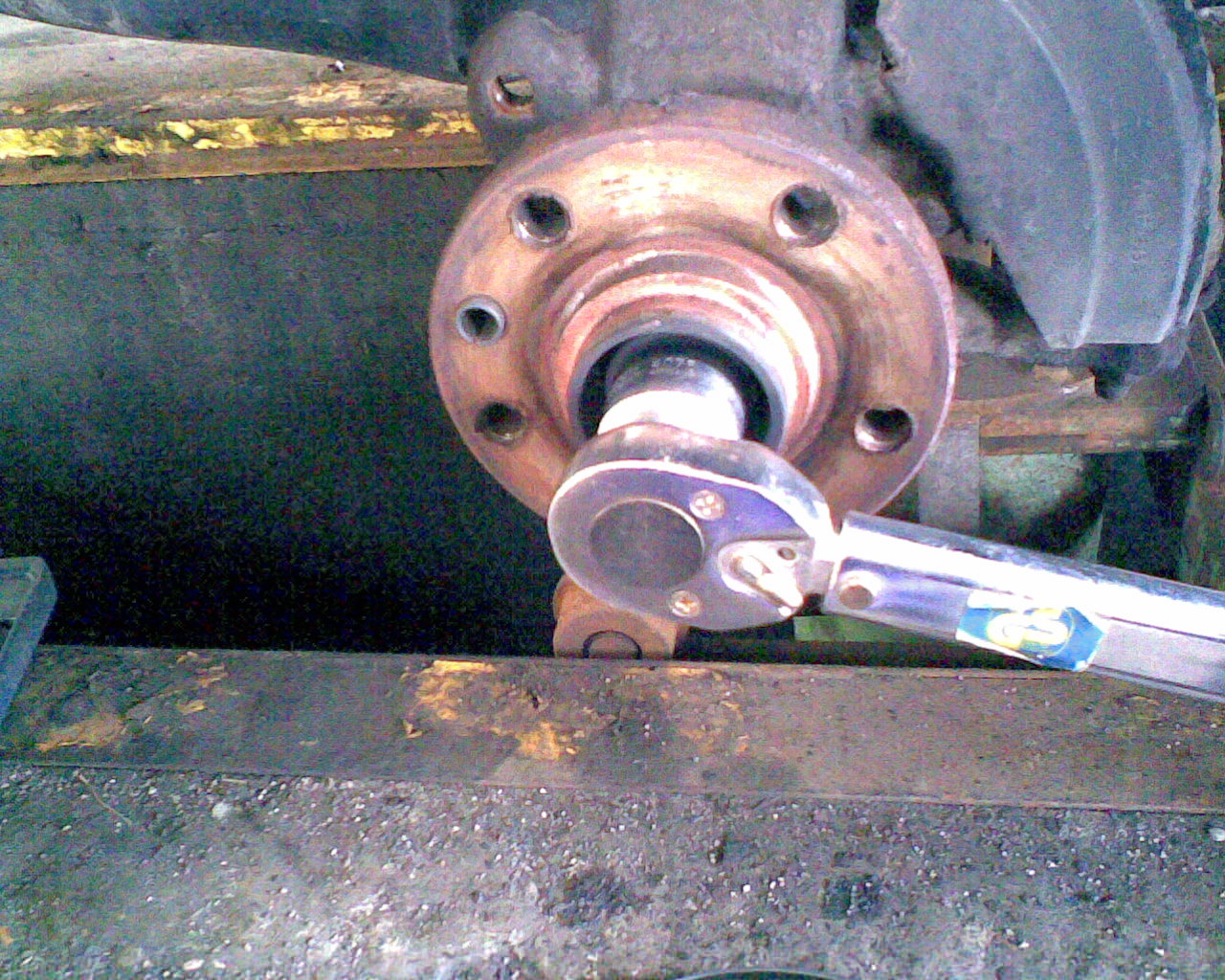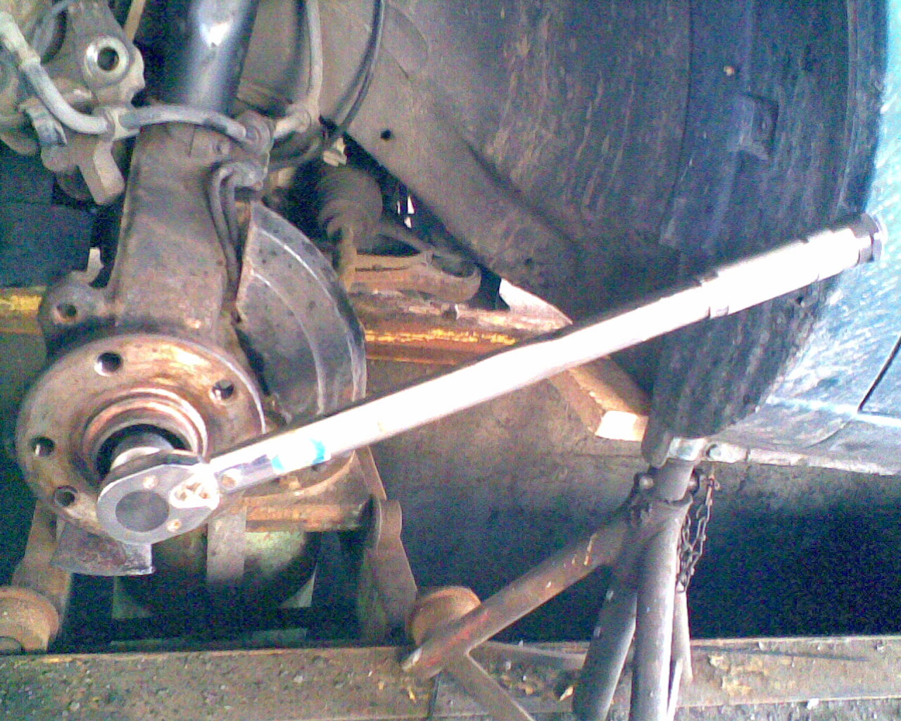 18.) Die neue Achsschraube mit 150Nm festziehen (noch kein Problem). Dann aber nochmal um 90° weiterdrehen, damit die Schraube die wichtige Vorspannung erhält. Für diesen Arbeitsschritt ist gutes stabiles Werkzeug wichtig!!