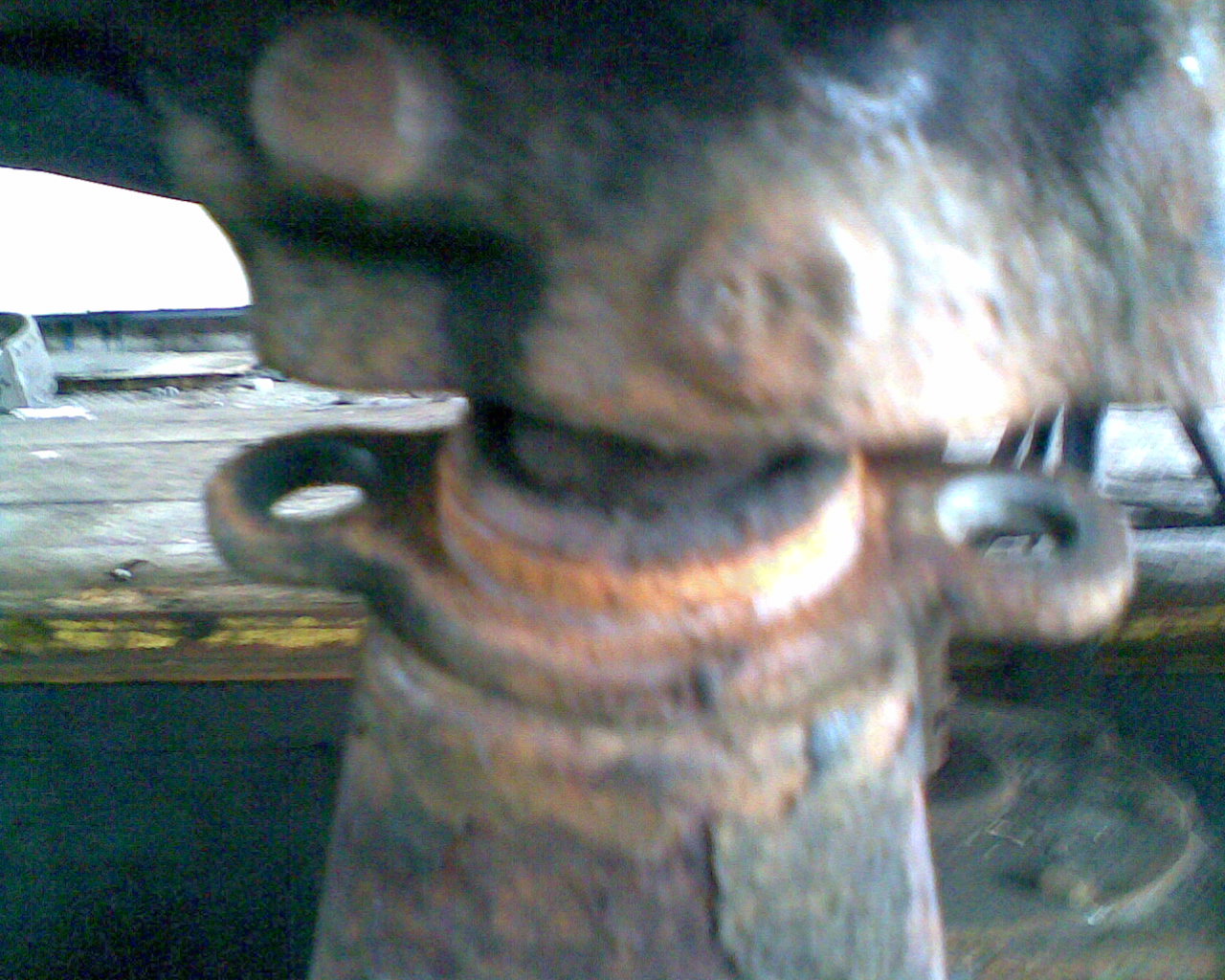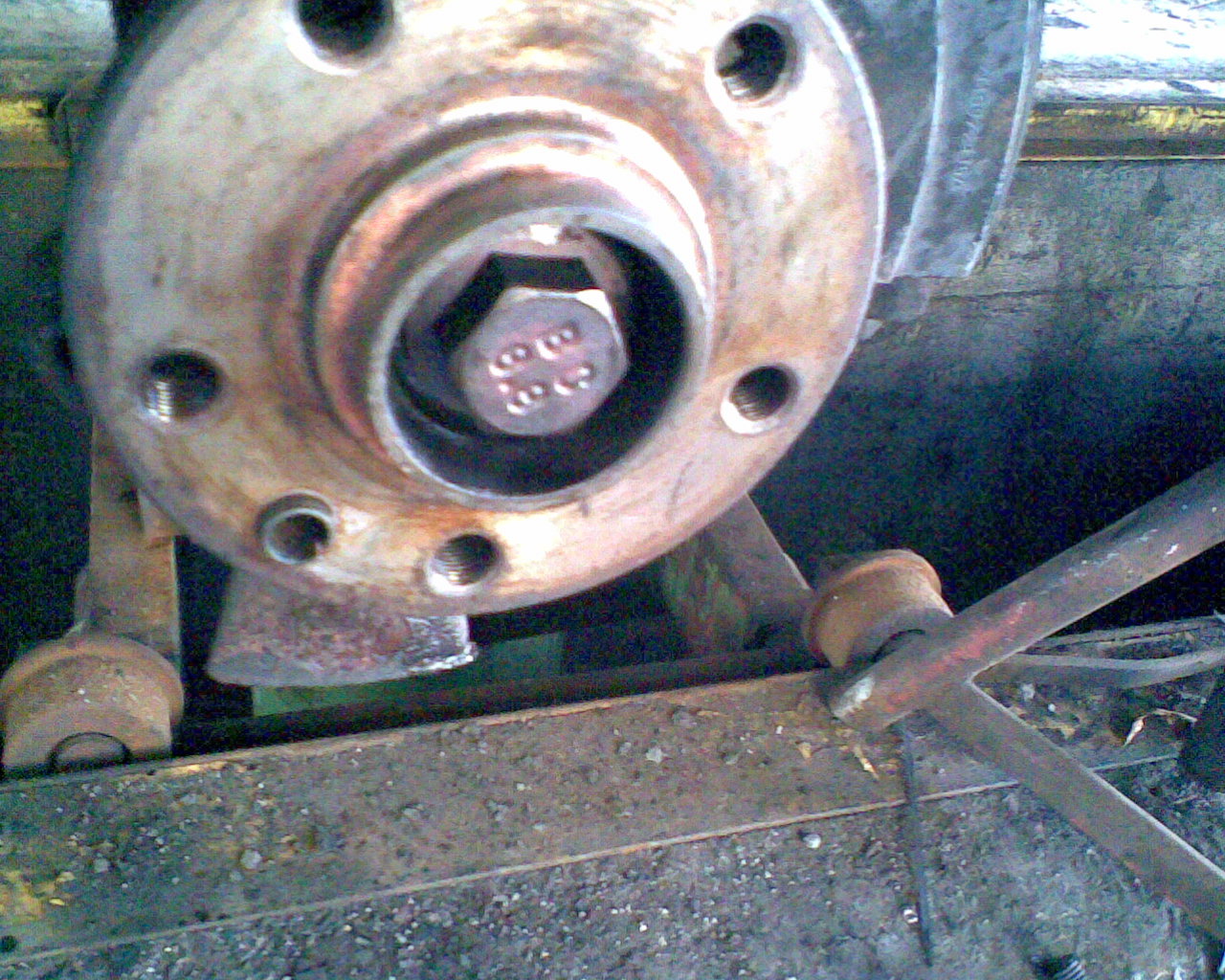 b)die Achsschraube, 27er Sechskantschraube, aber nur soweit, dass sie sich leichter drehen lässt. Sie sollte eine Vorspannung von 50Nm behalten.