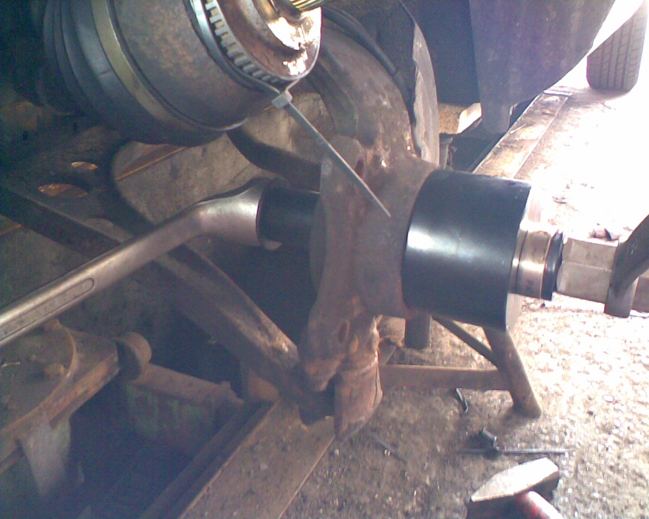 Es geht auch ohne Ausbau des Stossdämpfers und ohne Abbau der Spurstangenköpfe. Auch das Lösen der Koppelstange ist nicht notwendig . Auf jeden Fall muss die Spur nicht eingestellt werden, und das alleine finanziert das Radlagerauspresswerkzeug.